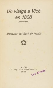 .1925.. LIBRO: .(LITERATURA CATALANA).. .BARÓ DE MALDÀ:. .UN VIATGE A VICH EN 1808. MEMORIES DEL... Vich: Tip. Balmesiana, 1925. 8º. 167 p. Enc. en tela, tejuelo, corte superior dorado, conserva las cubiertas originales. Marca de caucho de...