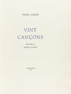 161 p. + 1 h. Con las partituras de piano y voz de las 20 canciones. Arreglos realizados por J. Zamacois, N. Bonet, J. Serra, etc. Dos vol. enc. en tela, tejuelo, corte superior dorado, conservan las cubiertas originales. Ejemplar de los 30 sobre papel de hilo con filigrana Molí Vell, de un total de 166 ejemplares, con la firma del autor.