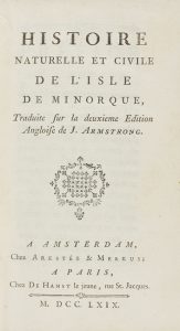 Un mapa de Menorca de 30x32 cm. Dos láminas plegadas conteniendo reproducidos diversos fósiles, una naveta y una taula. El texto de la obra termina en la página 278, sigue después hasta el final: Livres Nouveaux, qui se trouvent chez le même Libraire. Enc. de la época en plena piel jaspeada, cortes pintados. Ex-libris del siglo XIX, grabado y encolado ´Baron d´Espiard´. Primera edición en lengua francesa de esta clásica obra sobre la historia natural y civil de la isla de Menorca. Publicada por vez primera en lengua inglesa en Londres 1752. El mapa que acompaña todas las ediciones es considerado el primer ensayo cartográfico serio sobre la isla, recoge mucha toponimia en lengua catalana y su exactitud la hizo válida durante todo el siglo XVIII.