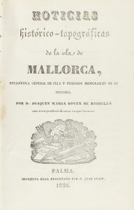 Guasp, 1836. 8º menor. 243 p. Enc. en holandesa media piel y puntas color habano. Hojas de guarda pintadas al agua. Viñeta grabada en la portada. Bello ejemplar. Primera edición de esta descripción geográfica y estadística de la isla de Mallorca. La información es detallada y de buena fuente como todo lo que trabajaba Bover. Palau 34176. Bover 69.