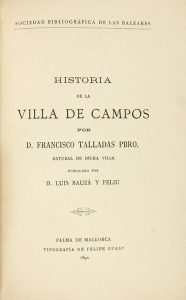 .1892.. LIBRO: .[MALLORCA].. .TALLADAS, FRANCISCO:. .HISTORIA DE LA VILLA DE CAMPOS POR., NATURAL DE DICHA VILLA. PUBLICADA POR LUIS BAUZÁ Y FELIU. Palma de Mallorca: Tipografía de Felipe Guasp, 1892. 8º. XV-247 p. Enc. en medio pergamino con...