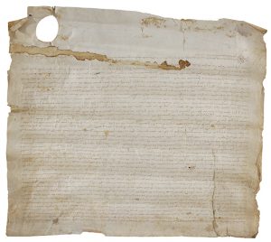 .1383.. MANUSCRITO: .DOCUMENTO MANUSCRITO SOBRE PERGAMINO DE UNA ESCRITURA DE PROPIEDAD.. Baix Empordà, 1383. 58 x 64 cm. Pergamino manuscrito correspondiente a una escritura de un lote de tierra, colindante con el Mas Vinyals. Firma de Andreas...