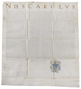 de infançon dados a Pedro Moles, habitante de la ciudad de Cesaraugusta (Zaragoza), en audiencia real en el año de 1555. Al pie un bonito escudo heráldico coloreado, con un yelmo y cruz de Caravaca. El documento está realizado en nombre de ´locumtenens et capitaneus gener/ pro su magestate in presenti aragonum regno´ (lugarteniente y capitán general por su magestad en el presente Reino de Aragón), Diego Hurtado de Mendoza, de quien con toda probabilidad es la firma que figura al final, junto al escudo real. Documento de extraordinaria peculiaridad, dado por Diego Hurardo de Mendoza y de la Cerda durante el breve período en el que ocupó el cargo de lugarteniente general del reino de Aragón, entre 1554 y 1556. Su nombramiento ya constituyó una anomalía que no gustó en la Diputación General de Aragón, pues era un cargo reservado exclusivamente a caballeros aragoneses, él era castellano. Durante estos dos años cometió graves irregularidades en dos procesos, ignorando los Fueros de Aragón y el singular régimen que constituían; esto hizo que se ganara la enemistad de sus súbditos y provocó su precipitada huída. Teniendo en cuenta el poco tiempo que ejerció este cargo, el presente documento debe ser uno de los pocos que se conservan con su firma.