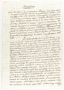 DE NUESTRO REPOSO [...] QUE EL MANIFIESTO ANTCEDENTE SE IMPRIMA Y PUBLIQUE EN TODO EL REYNO DE ARAGÓN PARA SU INTELIGENCIA, CIRCULANDOSE ADEMÁS A LAS CAPITALES Y CABEZAS DE PARTIDO DE TODAS LAS PROVINCIAS, Y REYNOS DE ESPAÑA. DADO EN EL QUARTEL GENERAL DE ZARAGOZA A 31 DE MAYO DE 1808. EL GOBERNADOR Y CAPITÁN GENERAL DEL REYNO DE ARAGÓN. PALAFOX. [Zaragoza, u otra ciudad]: 1808. 4º mayor. Manuscrito sobre papel con verjura y filigrana, dos hojas en pliego escritas tres caras. Caligrafía clara y muy legible. En perfecto estado de conservación, marcas de antiguos pliegues. Manuscrito de la época (posiblemente mismo año de 1808) de uno de los manifiestos mas importante de la Guerra de la Independencia española. En la cuarta cara del pliego (que se encuentra en blanco) aparece escrita con la caligrafía de la época la palabra ´Noticias´.
