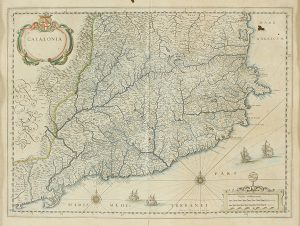 una con el escudo de armas de Barcelona y el título del mapa y la otra con la escala gráfica en millas españolas (1 milla = 63 km). Papel de sólida textura y ámplios márgenes. Ligeros puntos de óxido, pequeñas faltas y rasgadura en la doblez inferior. Gran calidad tipográfica. Interesante descripción de Cataluña en el reverso. «Los catalanes son más vivos y más hábiles que los aragoneses; aunque menos decididos y firmes. El amor por la libertad potencia su valentía y el odio hacia el trabajo lleva a algunos a elegir un oficio fácil pero peligroso» (J. Blaeu).
