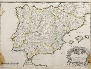 . .CARTE GENERALE D´ESPAGNE ET DE TOUS LES ROYAUMES. París, 1641. Huella: 42 x 57 cm, papel: 43,5 x 57 cm. Mapa grabado al cobre y coloreado a mano. Incluye dos cartelas: una con el título del mapa y el autor, y...