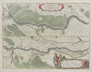 escala. Aunque Blaeu es el autor del mapa, se basa en los viajes y descripciones de A. Oleario. [Mas:] .TRACTATUS BORYSTHENIS vulgo DNIEPR et NIEPR dicti. .Dos mapas, 42,5 x 56 cm, divididos en dos partes con bonitas cartelas en la esquina inferior derecha. Coloreados a mano y extraidos de la obra ´Atlas Maior, Sive Cosmographia Blaviana, Qua Solum, Salum, Coelum, Accuratissime Describuntur´. Estos dos mapas pertenecen a un set de cuatro, que son los que conforman la descripción completa del río Dnieper.