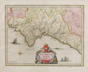 .1662.. MAPA: .BLAEU:. .VALENTIA REGNUM. Amsterdam: 1662. Mapa grabado al cobre y coloreado a mano de época. 39 x 50 cm, plancha y 56 x 65 papel.