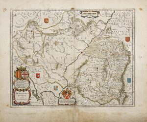 Aragón (izquierda) y Cerdeña (derecha). La cartela pequeña en la parte superior del mapa contiene la escala gráfica en millas españolas (1 milla española = 63 km). Interesante descripción del Reino de Aragón en el reverso. Gran calidad tipográfica. «Este reino contiene unos 70 lugares habitados, rodeados de murallas pero en su mayoría pequeñas, pocos tienen más de 500 hogares, excepto las siete ciudades» (J. Blaeu). Buen estado de conservación. Papel levemente tostado. Refuerzo del pliegue central y margen inferior en el dorso, pequeñas manchas en los márgenes que no afectan al grabado. Procedencia: J. Blaeu, Atlas Maior, Sive Cosmographia Blaviana, Qua Solum, Salum, Coelum, Accuratissime Describuntur, Vol. II, Ámsterdam, 1667.