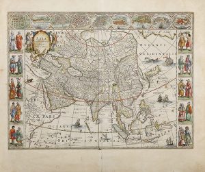 la parte superior hay nueve ciudades y colonias comerciales: Candi, Calcuta, Goa, Damasco, Jerusalén, Ormus, Bantam, Aden y Macao. En la izquierda hay figuras ataviadas con las vestimentas tradicionales de Siria, Arabia, Armenia, Persia, Balaguata y Sumatra; a la derecha pueden verse figuras de habitantes de la isla de Java, las islas Molucas y Banda, China, Moscovia y Tartaria. Incluye una cartela ricamente ornamentada, con el título y el autor en latín. Gran calidad tipográfica. Amplios márgenes. Papel de sólida textura, levemente tostado. Restauración en el dorso del pliegue central, que no afecta al grabado. Procedencia: J. Blaeu, Atlas Maior, Sive Cosmographia Blaviana, Qua Solum, Salum, Coelum, Accuratissime Describuntur, Vol. VII, Ámsterdam, 1667.