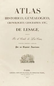 .1826. MAPA: .(ATLAS).. .LE SAGE. / LAS CASAS, CONDE DE:. .ATLAS HISTÓRICO, GENEALÓGICO, CRONOLÓGICO, GEOGRÁFICO, ETC., DE LESAGE. Paris: En la imprenta de Firmin Didot, 1826. Gran folio. 2 h.+ 4 p. + 35 lám. iluminadas en colores muy marcados...