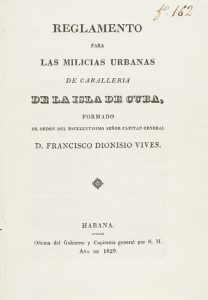 .1829. LIBRO: .(MILITARIA).. .VIVES, FRANCISCO DIONISIO:. .REGLAMENTO PARA LAS MILICIAS URBANAS DE CABALLERIA DE LA ISLA DE CUBA, FORMADO DE ORDEN DEL ESCELENTISIMO SEÑOR CAPITÁN GENERAL D. FRANCISCO DIONISIO VIVES. [26 DE SEPTIEMBRE 1829]. Habana:...