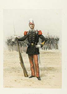 .1885-1889.. LIBRO: .(MILITARIA).. .RICHARD JULES (TEXTO) y DETAILLE ÉDOUARD (ILUSTR.):. .TYPES ET UNIFORMES. L´ARMEE FRANÇAISE. Paris: Ed. Bousod, 1885-1889. Folio mayor. 128 p. + 33 lám. y 116 p. + 29 lám. + 6 h. Dos tomos enc. en un vol....