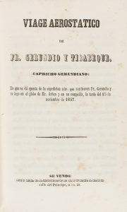 .1847.. LIBRO: .(VIAJES).. .[LA FUENTE]:. .IAGE AEROSTATICO DE FR. GERUNDIO Y TIRABEQUE En que se da cuenta de la espedicion aérea en globo el 15 de noviembre de 1847. Madrid: Imp. de Mellado, 1847. 8º. 2 h. + III p. + 151 p. 6 lám. grabadas....