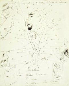 Dessin original à l’encre de René Crevel qui signe Fra Crevello pour le cinquantième anniversaire du célèbre éditeur allemand. Le dessin représente Flechteim en Saint Sébastien vers lequel des flèches convergent. Le dessin est titré par Crevel : « Pour le cinquantenaire du Saint Sébastien des Lutzowufer. Flechteim/Les Flèches t’aiment/50 années/50 flèches ». Dans les marges figurent 5 dessins originaux, le premier l’ange boxeur te protège, les 4 autres représentent des pastiches d’œuvres de Fernand Léger, Marie Laurencin, Chirico et René Sentenis (sic). A noter que Crevel masculinise le nom de Renée Sintenis.