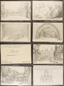 escritos y fotografías relacionados con el artista. Contienen más de 1500 bocetos originales de teatrinos y algunos de flores. 11 x 7 cm. El artista reprodujo muchos decorados del Liceo donde asistía a todas sus representaciones. Actualmente se conservan más de 200 teatrinos en el Museo del Arte Escénico de Barcelona.