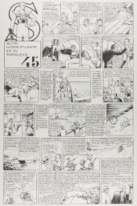 .1946. ORIGINAL ARTÍSTICO: .(CÓMIC).. .BUIGAS:. .TBO S. Arte Original de Serra Masana, página interior protagonizada por el personaje central de esta publicación titulada ´Ruta horripilante en el paralelo 45´. Uno de los primeros superhéroes...