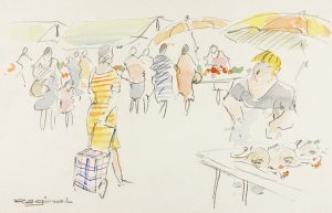 .1950 ca. ORIGINAL ARTÍSTICO: .RAGINEL:. .VISTA DE UN MERCADO.. Acuarela, 16 x 25 cm. Algo sucio.