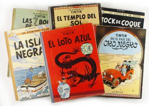 (x2) y VUELO 714 PARA SIDNEY. 6 cuadernos de la segunda edición: LAS JOYAS DE LA CASTAFIORE; STOCK DE COQUE; LAS SIETE BOLAS DE CRISTAL; EN EL PAÍS DEL ORO NEGRO; EL TEMPLO DEL SOL y LA ISLA NEGRA. 2 cuadernos de la primera ed. en catalán (1967): L´AFER TORNASOL y TINTIN A AMERICA. 4 ejemplares de la edición de 1965: TINTIN EN EL TIBET; ATERRIZAJE EN LA LUNA; OBJETIVO: LA LUNA y LA OREJA ROTA. 16 vol. enc. en media tela, cantos ligeramente rozados. Ex-libris de anterior poseedor.