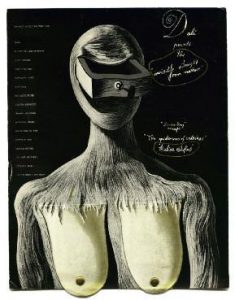 Catalogue de l’exposition Dali à la Galerie Julien Levy à New York en 1936, imprimé à Paris par Union. Au recto : 2 pochettes figurent deux seins de femmes, chacun fixé par un bouton pression, l’ensemble couvrant 12 reproductions dépliantes d’œuvres de Dali. RARE ET GÉNIAL DOCUMENT.