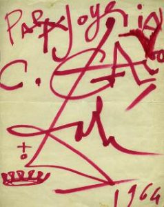 Dessin original au marqueur rouge calligraphié, dédicacé, daté 1964 et signé par Dali : Para Joy Eria. Galvo. (Très légère tache). Galvo fut un célèbre joaillier espagnol.
