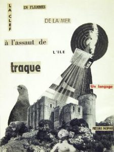 ALBUM UNIQUE COMPORTANT UNE DÉCALCOMANIE ORIGINALE SERVANT DE FRONTISPICE PORTANT LE TITRE ET LE NOM DE L’AUTEUR ET 13 COLLAGES ORIGINAUX DE FORMAT 32 x 24 cm illustrés de textes découpés et contrecollés. EXEMPLAIRE DÉDICACÉ À ANDRÉ BRETON : « Pour André Breton un aveugle étoilé Pierre Dhainaut ». BELLE RÉALISATION ET SUPERBES COLLAGES DE PIERRE DHAINAUT.
