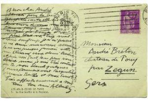 Carte postale autographe à l’encre très chaleureuse signée par Giacometti à André Breton. … « La très gentille carte me donne bien envie de venir vous voir dans ce pays mais pas moyen de bouger d’ici. Puis tout va trop mal depuis longtemps… Je ne suis presque jamais sorti, vu Eluard une demi-heure et hier au soir Péret. Je ne peux rien écrire mais je suis très content de te voir dans quelques jours. Comment vont Jacqueline, Marie-Berthe et Max Ernst ? »… RARE.