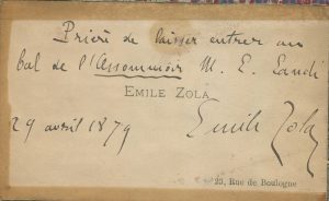 « Prière de laisser entrer au bal de l’Assommoir M. E. Landi Eaudi ? 29 avril 1879 Émile Zola ».