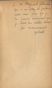 • « à M. Raymond Gallimard qui a eu assez de patience avec moi pour que je lui prouve désormais que je suis un auteur sérieux, son reconnaissant Desnos ».