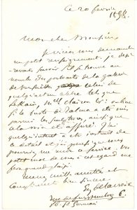 Il « désire savoir s’il se trouve au nombre des portraits de la galerie de Versailles celui de quelqu’acteur célèbre tels que Lekain, Melle Clairon &c. ; ou bien si le buste de Talma a été mis parmi les sculptures, ainsi que cela m’a été assuré »… Il donne son adresse : « rue de Furstenberg 6 Fb. St Germain ».