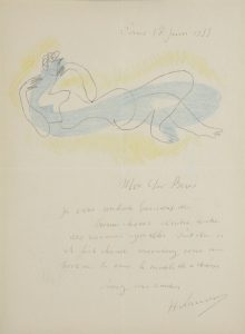 Un grand dessin à la plume en tête de la lettre représente une femme nue allongée, rehaussée aux crayons de couleur bleu et jaune.