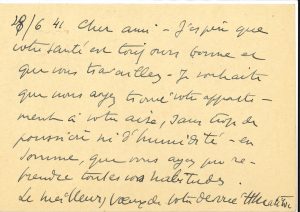 Henri MATISSE (1869-1954).— L.A.S., — Nice 28 juin 1941, — à Henry de Montherlant à Paris ; — 1 page oblong in-12, adresse au verso (carte postale).