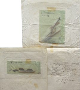 fragment de boiserie du Cabinet de l’Empereur ».2. « Plantes rapportées de Ste Hélène 4 mars 1838 ». Géranium sur le tombeau même de Napoléon cueilli à ses pieds. Feuille de pêcher devant la chambre de Longwood, planté p.l.m. Bois de la chambre à coucher et de la salle de réception. Un morceau du mur de son foyer. Morceau de l’ancien saule couché sur le tombeau. Espèce d’if autour du tombeau. Espèce de myrrhe autour de la source. Tous ces objets ont été pris à Ste Hélène le 4 mars1838 ».