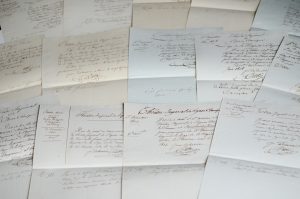 22.OPÉRA COMIQUE. 14 pièces manuscrites, signées. 1807-1812. Cachet de la collection Debauve sur tous les documents.Bordereaux de paiement du loyer de la loge de l’Empereur à raison de 3000 f. par trimestre, signés par le caissier général,...