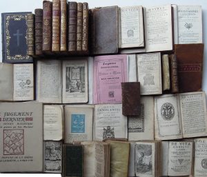 Jésus et traduit en François par le Père François Sodier… Toulouse, Colomiez, 1621.In-32, reliure basane en état médiocre. Vignette gravée sur le titre.•SAINT-AUGUSTIN. Les Confessions traduites par le Sr de Ceriziers… Paris, Le Petit, Veuve Camusat, 1647.In-12, reliure vélin. Titre-frontispice gravé.•Thomæ A. KEMPIS. Canonici Regularis… De Imitatione Christi. Libri Quatuor. Ex nova recensione Jacobi Merlo… Paris, Gourault, 1664. In-32, reliure veau brun (usagée).•GODEAU (Antoine). Paraphrase des Pseaumes de David. Paris, Veuve Camusat, Le Petit, 1649. In-12, reliure maroquin noir janséniste, tranches noires. Titre gravé.•MAROT et DE BÈZE. Les Pseaumes de David mis en rime Françoise par Marot et de Bèze. Charenton, Cellier, 1667. In-12, reliure veau brun. Épidermures, plat supérieur détaché.•Ceremonial de la Vesture et Profession des Chanoinesses du S. Sepulchre. Tours, s. n., 1664.In-8, reliure de l’époque veau brun (totalement épidermée avec qq. manques). 45 pp.