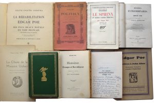percaline chagrinée ornés de filets à froid. Frottements sur les nerfs, coiffes et coins. xxxi-(1 bl.)-330-(1) pp. Qq. rousseurs, petite tache d’encre bleue en marge d’une vingtaine de ff.Seconde édition de la traduction de Baudelaire parue l’année de l’originale (mention Lagny, imprimerie de Vialat au verso du faux-titre et Crété à Corbeil à la Table des matières, la dernière ligne du titre (droits réservés) comporte un . et deux -; la note sur Rousseau p. 48 est suivie des initiales E.A.P.).•The Poetical Works of E. A. Poe edited by James Hannay with illustrations by E. H. Wehnert, J. Godwin, F. W. Hulme, H. Weir … Complete Edition. London, Griffin, s. d. (vers 1850).In-12, cartonnage éditeur percaline verte, décor or au dos et sur le premier plat, tête dorée. Petit accroc sur la coupe du premier plat. 189-(2) pp. Qq. rousseurs.•Histoires Étranges et Merveilleuses. Traduites de l’anglais par M.-D. Calvocoressi. Paris, Mercure de France, s. d. (1914).In-12, reliure à la Bradel recouvert de papier décoratif. 340-(3) pp. Rares rousseurs. Édition originale de cette traduction. Exemplaire numéroté (n° 97).