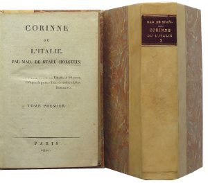 71.STAËL HOLSTEIN (Anne-Louise-Germaine, baronne de). Corinne ou l’Italie. Paris, s. n., Imprimerie des Annales des Arts et Manufactures, 1807.2 tomes en 2 volumes in-8, reliure (signée Arné Asper, Genève) à la Bradel demi-vélin, pièces de...