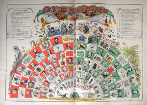 général.Jeu en forme d’hémicycle, chaque moitié ayant sa règle du jeu : l’une « de la gauche » dont les 49 cases représentent Rochefort, Gambetta, Grévy, Kératry… l’autre « de la droite » avec Granier de Cassagnac, Forcade de la Roquette, Belmontet… Signé par l’éditeur Vancortenberghen.