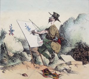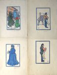 couleurs : Réunion de 4 bois représentant des personnages dans un encadrement bleu (13,5 x 8,5 cm), monogrammés LH et contresignés sous l’image.•MONNIER (Henry, 1799-1877). Les Grisettes dessinées d’après nature. Paris, Gaugain et Ardit, s.d. (1827). In-4, en ff. Couverture illustrée et 11 (sur 12) planches lithographiées et rehaussées en couleurs. Qq. rousseurs ou papier bruni, déchirures marginales dont une d’environ 10 cm touchant la légende de la pl. 10). Manque la pl. 7. Rare première série des Grisettes. On joint une douzaine d’estampes diverses de Henry Monnier dont : La Colère (lith. de Delpech); Souvenir d’Alger (lith. V. Rainer en couleurs, déchirure; Récréations (chez Banger); On ne peut pas nourrir tous ses Cousins (lith. de Senefelder) … •WILLETTE (Adolphe Léon, 1857-1926). Réunion d’estampes :•Menu (25 x 22,5 cm). Déjeuner offert à Willette pour les Artistes de la Rive gauche, 24 juin 1904. Signé en bas à gauche et dédicacé au centre par Willette à M. Martyne. Trous de punaise aux angles. •Deux Pierrots. Tirage en rose, non signé. Rousseurs. (23 x 17,8 cm).•Pierrot et Colombine. Epreuve sur Chine (35,5 x 25 cm).•Au Louvre. Au profit de l’Hopital de Saint-Ay. Pliures en marges. (37,5 x 28 cm).