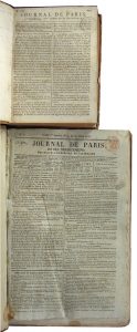 par Cerutti, Rabaut de Saint-Étienne, Grouvelle et Ginguené … « dont le but était de propager dans les campagnes les principes de la Révolution…» Hatin 170.•Journal de Paris. Du n° 181 au n° 270. 1er Germinal (22 mars) - 30 Prairial (20 avril) An X (1802).In-4, reliure demi-basane très usagée (dos en grande partie manquant). Page 1091 à 1682-(2). Bon état intérieur. •Journal de Paris. Du n° 1 au n° 365. 1824.In-4, cartonnage (dos décollé). Bon état intérieur. Contient des nouvelles nationales et étrangères, comptes rendus de cour d’assises, feuilletons littéraires, programmes de concerts, théâtre, expositions, Bourse de Paris, Loterie royale…•La Quotidienne. Supplément à La Quotidienne. 4 juin - 25 décembre 1837.In-4, reliure demi-veau brun, dos lisse orné. Manque en pied. Supplément hebdomadaire de 8 pp. paraissant le dimanche proposant l’actualité de la Littérature, des Sciences, des Arts, des Théâtres, etc. Texte sur deux colonnes, qq. vignettes dans le textes. Hatin 234.•Affiches, demandes, annonces, avis divers du Blanc. nov. 1861.