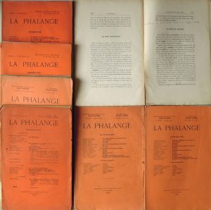 118.REVUE. La Phalange. Revue mensuelle. Rédacteur en chef : Jean Royère. Réunion de 7 numéros. 1907-1911. 7 numéros in-8, brochés. Couvertures orange. Dos cassés. N° 14 du 15 août 1907 (textes de Nau, Carco, Gonzague Frick…); N° 18 du 15...