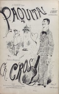 état.Partition recherchée qui fut imprimée en deux formats. Cros, Œuvres Complètes, Pléiade, p. 1199 : « Rare document ». Créée par Libert aux Ambassadeurs, la partition dédiée à Coquelin cadet est la seule œuvre dont Charles Cros est également le compositeur.