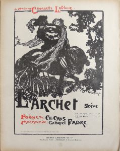 134.[CROS]. FABRE (Gabriel). L’Archet, Scène. Musique de Gabriel Fabre. Poème de Charles Cros. N° 2 Edition pour Mezzo-Soprano. Paris, Bruxelles, Henry Lemoine, s. d. (1895).In-4, en feuillet. Chant et violoncelle (3 pp.). Chant et Piano (5...