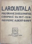 141.BIROT (Pierre-Albert). Larountala. Polydrame en deux parties composé en 1917-1918. Paris, Editions SIC, 1919.In-8, agrafé. Couverture défraîchie (petites déchirures en bordures, qq. taches). 92-(1) pp. Derniers cahiers en partie dégrafés,...
