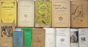 Éditions de la Plume, avec privilège d’Ubu Roy, 1902.In-8, broché. Couverture illustrée. 180-(3) pp. Qq. rousseurs.•GOUDEAU (Emile). Chansons de Paris et d’ailleurs. Paris, Charpentier, 1896.In-8, broché. Envoi à Edmond Frontier.•IBELS (André, sous le pseudonyme de Roy Lear). Talentiers. Ballades libres. Dessins d’Ernest La Jeunesse. Bibliothèque d’art de la Critique, 1899.In-8, broché. Dos cassé. Couv. illustrée. 160 pp. Caricatures d’écrivains.