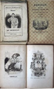 imitation peau de serpent, fleuron doré au dos, traits noirs en encadrement sur les plats, tête rouge. Couvertures conservées. T. 1 : Frontispice, titre gravé, (4)-145 pp. T. 2 : Frontispice, titre gravé, (4)-163 pp. Qq. rousseurs. Ex-libris : Théodore de Banville (gravé par Émile Royer) sur chaque volume. Provenance : Vente Sicklès n° 2811. •AMBS-DALES (J.-B.). Histoire de Deburau. 3e édition aug-mentée de son procès devant la Cour d’assises. Paris, Bourdin, 1836.In-12, sommairement broché, conservée dans une chemise cartonnée. Couverture illustrée. 36 pp. Rousseurs.Troisième édition comportant comme les précédentes une critique contre l’ouvrage de Jules Janin et possédant en plus le compte rendu du procès intenté à Deburau (suite au décès accidentel du jeune Vielin qui l’avait insulté et qu’il avait frappé d’un coup de canne, Deburau, accusé de meurtre, fut acquitté).