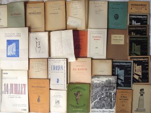 1929.•BATY (Gaston). La Passion. Lyon, Phily, 1905. In-8, broché. Bon exemplaire. E. O. de son premier livre.•GHÉON (Henri). Le Pauvre sous l’escalier. NRF, 1920.In-12, reliure (signée Yeux succ. De Simier) Bradel vélin ivoire, dos lisse orné, écusson Château de Vertcœur sur le mors. Ex-libris (par de Andrada). Envoi de Ghéon à René Philipon et LAS au même jointe.•MEUNIER (Mario). Antigone. Tragédie de Sophocle. Edition du Feu, 1907. In-8, broché. Premier plat détaché. Envoi à Ernest Charles. •ROY (Jules). Les Cyclones. NRF, 1954. Envoi à Bertrand d’Astorg.•RUDIGOZ (Roger). La Mort d’un autre. Guignol pour Adultes dédié aux têtes qui repoussent. Vodaine, 22 mai 1968. E. O. sur papier kraft tirée à 300 ex. •Théâtre d’Ombres. BONNAUD, BLÈS, BOYER. Ulysse à Montmartre. Dessins de Giffey, Décors de Gyaniny. Présenté au théâtre d’ombres du Logis de la Lune Rousse. Éd. La Lune rousse, 1910.•Théâtre Marigny. Catalogue de vente Successions Renaud-Barrault. Étude Tajan, 27 juin 1995. Annoté.
