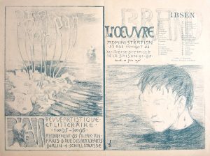 157.[THÉÂTRE]. SATTLER (Joseph, 1867-1931). Affiche de théâtre pour la pièce Brand d’Henrik Ibsen au Théâtre de l’Œuvre. 22 juin 1895. Lithographie en bleu-vert (32,4 x 43,5 cm) pour la revue artistique et littéraire Pan. Légère pliure...