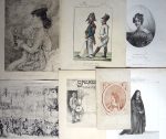 d’après Parrocel (1736). Trace de mouillure dans la partie basse, qq. rousseurs.• Miss Brunton dans le rôle d’Horatia. Eau-forte (13 x 10 cm) au pointillé par Walker (?) tirée en sanguine (1785). • Rôle de Fanfan Latulipe, Rôle de Jeanjean. Lithographie en couleurs de Joly (Engelmann, 1820). Réf. Bibliographie de la France, n° 868. • Portrait de Sarah Bernhardt gravé par Champollion d’après Bastien Lepage (1879) paru dans la revue L’Art. Qq. rousseurs.• Caricatures (d’Arnal, Lemaitre…) du Panthéon charivarique.• Personnages de théâtre. Planche de personnages (Imageries d’Epinal).