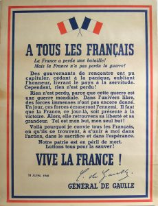 167.[AFFICHE]. Appel du 18 juin 1940. S. l., s. d.65 x 50 cm. Hormis une petite déchirure de 2,5 cm en marge sans atteinte au texte, bel état. Retirage de 1944 destiné aux mairies et administrations, pour la France et l’Afrique du Nord.